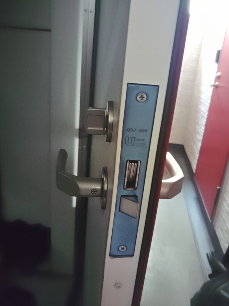 さて、ドアには典型的なUSHIN-SHOWA QDJ695タイプです。特にスマートロックなどもないとのことですので、通常サムターン解錠で完了しました。