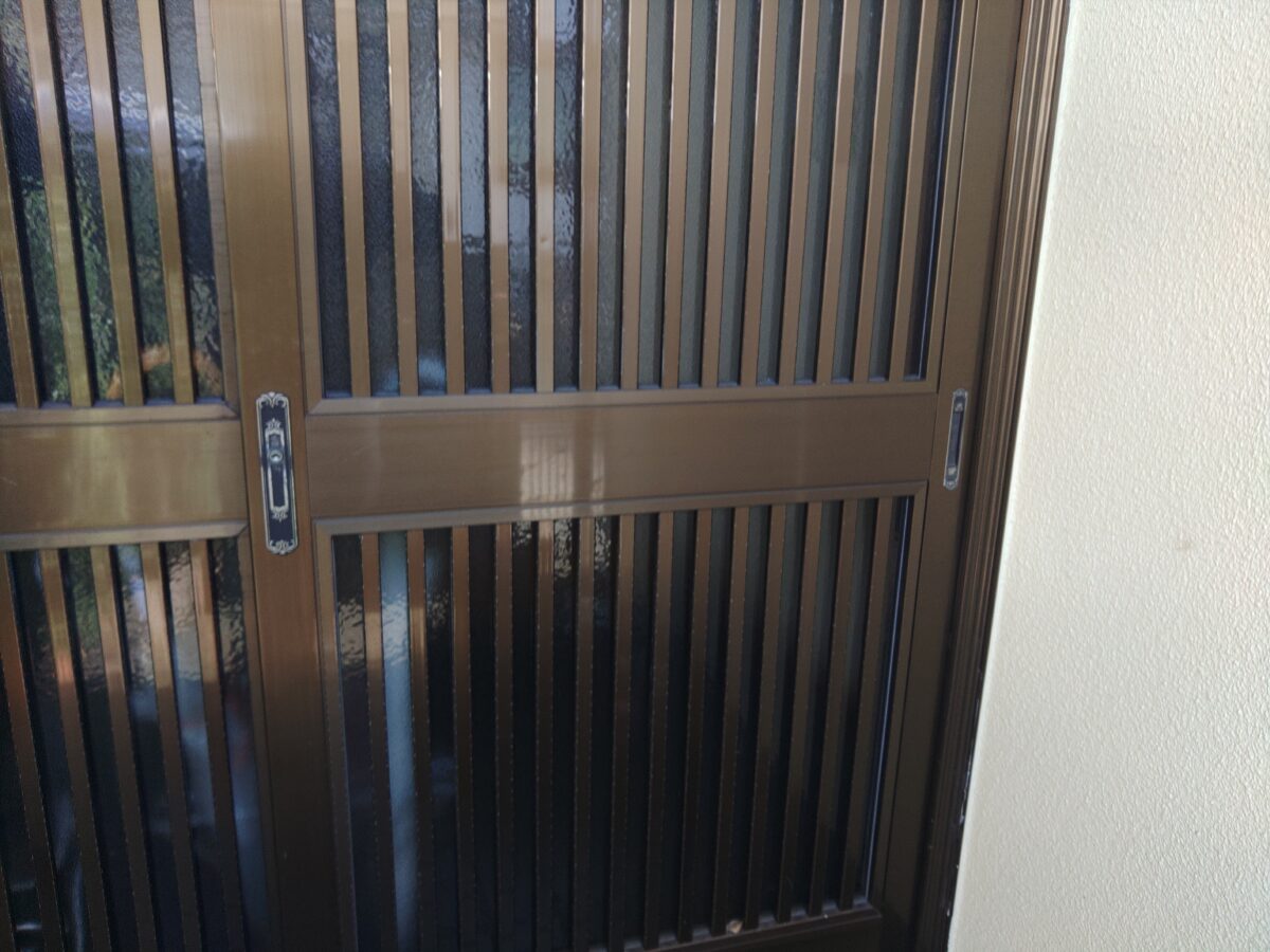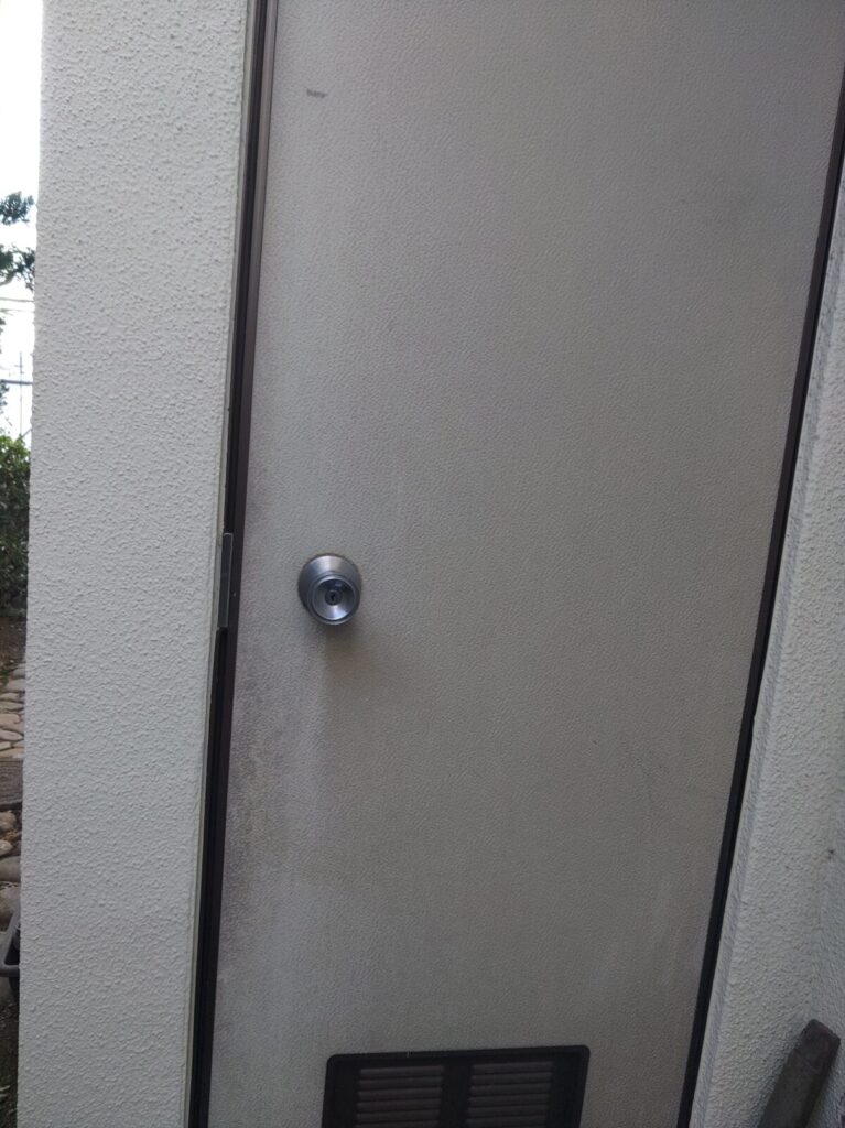 この作業には、それなりの段取りが必要になります。まれなケースなので、その特殊解錠方法で進めてみたいところです。しかし、先ずはセオリー通り他の入り口を確認してみました。勝手口や掃き出し窓です。先ずは勝手口です。裏側へ進んでみると、結構古い戸建てです。やはり玉座が付いていました。
